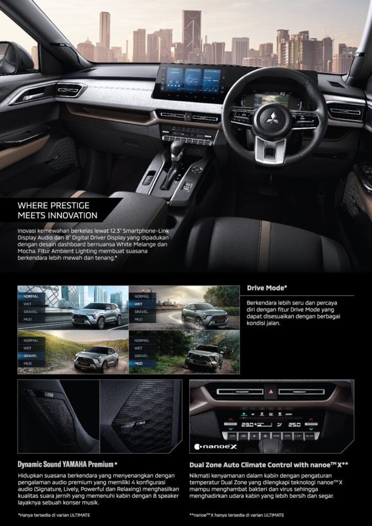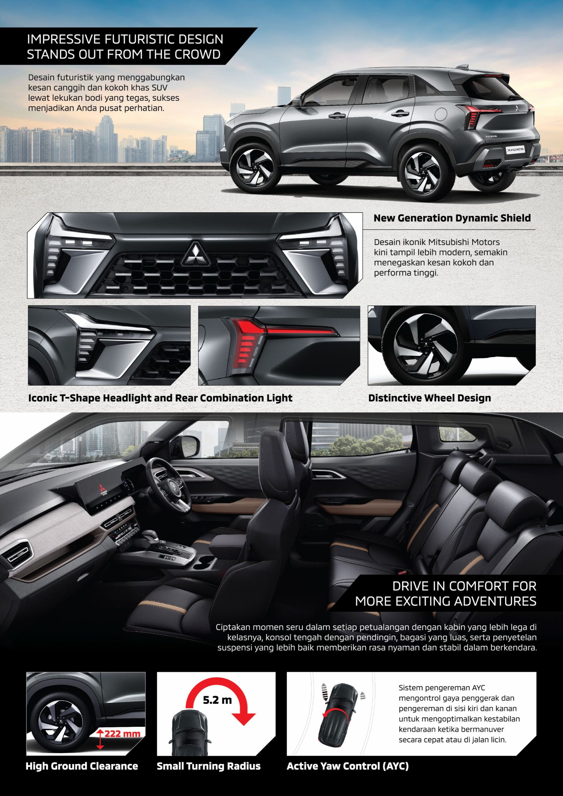 Desain Mitsubishi XForce memberikan kesan elegan dan desain yang mengalir harmonis dengan soliditas yang kuat. Sejalan dengan filosofi desain “Robust & Ingenious” dari Mitsubishi Motors, Mitsubishi XFC Concept menggabungkan aura SUV yang kompak namun kuat, dan mengesankan dengan permukaan ramping yang membentuk satu aliran yang terhubung, mulai dari emblem tiga berlian di bagian depan, memanjang ke sisi samping, hingga bagian belakang.